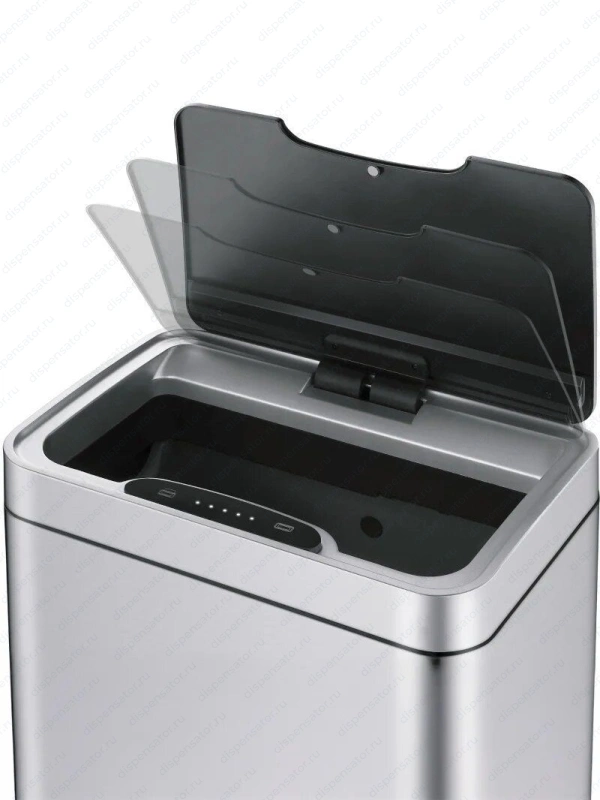 Отличительной чертой этой модели является сенсорное открывание, что делает использование урны максимально удобным и гигиеничным. Инфракрасный сенсор, расположенный на крышке, срабатывает на расстоянии 28-35 см, обеспечивая бесконтактный доступ к ведру с отходами. Крышка модели оснащена механизмом Soft Close, что позволяет ей плавно и бесшумно закрываться.